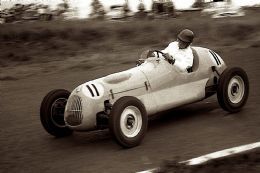 It was no mean feat for the ingenious driver and his brilliantly self-engineered little Jennings Riley Special – he once again had to go mano-a-mano for the win as he beat Horse Boyden and Lindsay’s F1 Cooper-Bristols. Jennings and Boyden fought it out as Horse set the fastest lap in the Scuderia Lupini car, but Bill used every ounce of his lightweight special’s famous nimbleness to pull another brave move around the outside of the red Cooper on one of the Circles fastest bends.