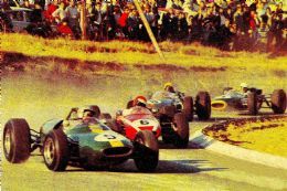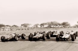 Jack Brabham was overheard to mutter, “I just can’t let this bloke beat me,” before going on to pip the Rhodesian to pole with a lap 0.1 seconds quicker in his Goodyear shod Brabham powered by an identical 2.7-litre Climax engine. Another local hope, Peter de Klerk and visitor Bob Anderson’s Braham BT 11 Climax 2.7s occupied row 2 with Innes Ireland’s 2-litre Lotus 33 BRM 2-litre V8 and Jo Bonner’s 1.5-litre Lotus 25 Climax V8 next up from Paul Hawkins’ Lotus 25 Climax 2.7, Jo Siffert’s Brabham BT11-BRM 1.5 V8, Sam Tingle’s LDS 2.7 Climax and Doug Serrurier’s 2-litre version in the top ten
